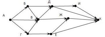 На рисунке – схема дорог, связывающих города А, Б, В, Г, Д, Е, Ж, И, К. По каждой дороге можно двигаться только в одном направлении, указанном стрелкой.