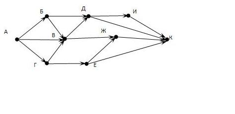 На рисунке – схема дорог, связывающих города А, Б, В, Г, Д, Е, Ж, И, К. По каждой дороге можно двигаться только в одном направлении, указанном стрелкой.