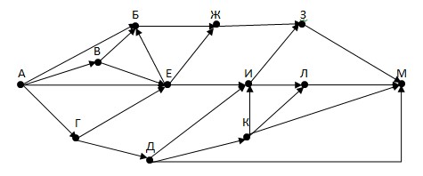 На рисунке представлена схема дорог, связывающих города А, Б, В, Г, Д, Е, Ж, З, И, К, Л, М. По каждой дороге можно двигаться только в одном направлении, указанном стрелкой. Сколько существует различных путей из города А в город М?