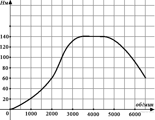 На графике изображена зависимость крутящего момента двигателя от числа его оборотов в минуту. На оси абсцисс откладывается число оборотов в минуту, на оси ординат — крутящий момент в Н м. Какое наибольшее число оборотов в минуту должен иметь двигатель автомобиля, чтобы крутящий момент был 120 Н