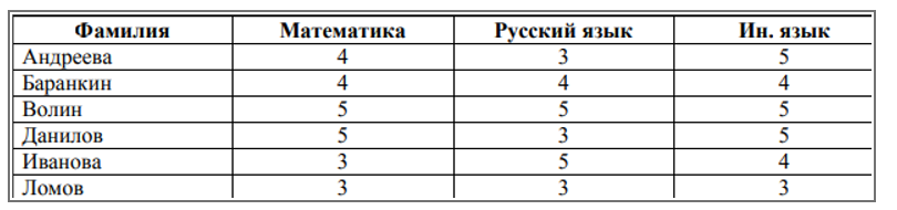 Сколько записей во фрагменте таблицы удовлетворяют условию («Математика = 4») и («Русский язык = 3»)?