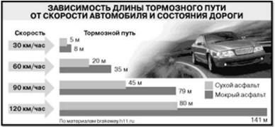 - Длина тормозного пути на мокром асфальте более чем в 1,5 раза больше длины тормозного пути на сухом асфальте