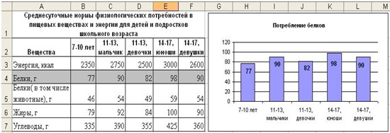Для более наглядного представления данных, выделенных в таблице (строка 4- Белки, г), воспользовались построением диаграммы. Какой вид диаграммы использовался при построении диаграммы «Потребление белков».