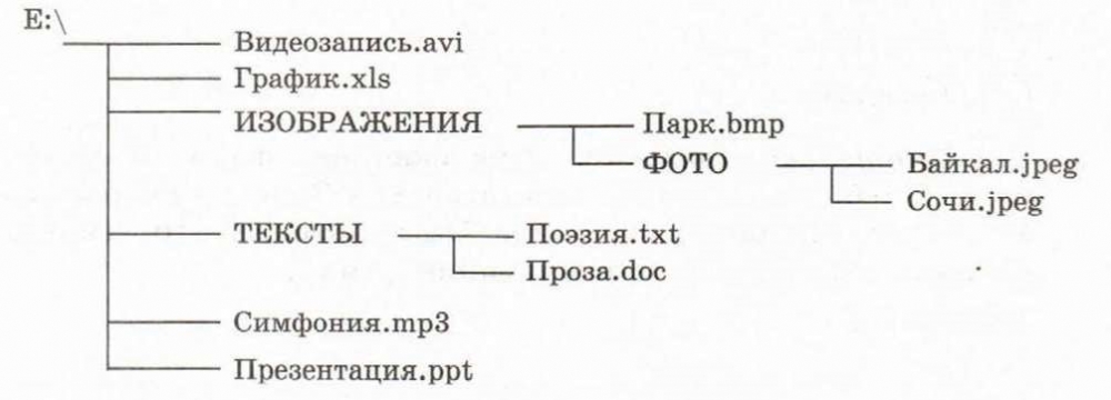 Руслан хотел поделиться впечатлениями о летнем путешествии с друзьями, но забыл, где именно он сохранил фотографию Байкал.jpeg. Ниже представлена файловая структура диска Е: