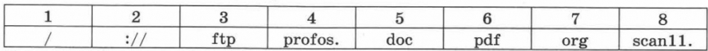 Доступ к файлу profos.org, находящемуся на сервере scan11.pdf в папке doc, осуществляется по протоколу ftp. Фрагменты адреса файла закодированы цифрами от 1 до 8. Запишите в ответе последовательность цифр, кодирующую адрес указанного файла в сети Интернет.