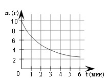В ходе химической реакции количество исходного вещества (реагента), которое еще не вступило в реакцию, со временем постепенно уменьшается. На рисунке эта зависимость представлена графиком. На оси абсцисс откладывается время в минутах, прошедшее с момента начала реакции, на оси ординат – масса оставшегося реагента, который еще не вступил в реакцию (в граммах). Определите по графику, сколько граммов реагента вступило в реакцию за три минуты?