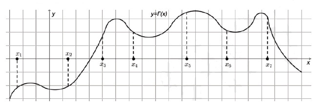 На рисунке изображена производная функции f `(x). На оси абцисс отмечены семь точек. В скольких из этих точек функция возрастает?