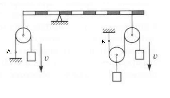 Скорости грузов указаны на рисунке. Чему равен модуль скорости точки A в системе отсчета связанной с точкой B? Куда направлена эта скорость? Скорость \(\upsilon\) = 3 м/с.