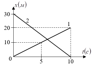 Чиймеде кыймылдагы эки нерсенин координаталарынын графиктери көрсөтүлгөн. Алардын бири-бирине салыштырмалуу ылдамдыктары эмнеге барабар?
