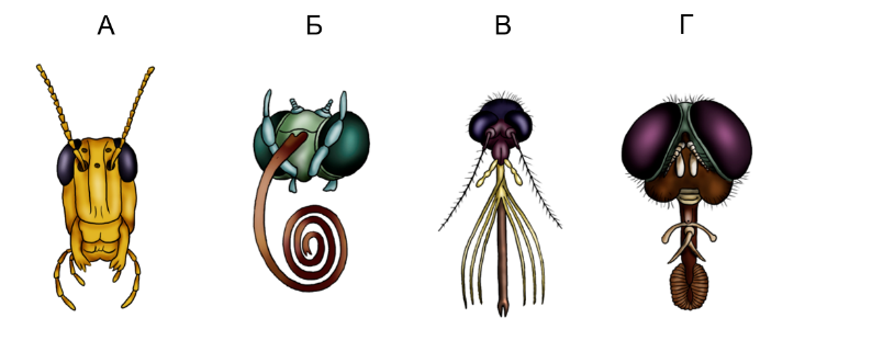 Соотнесите типы ротовых аппаратов насекомых, изображенных на рисунке и их названия.