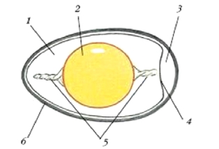 Рассмотрите рисунок с изображением строения яйца птицы и определите, какая структура обозначена на рисунке цифрой 1, выберите, что относится к особенностям её строения и биологическое значение.