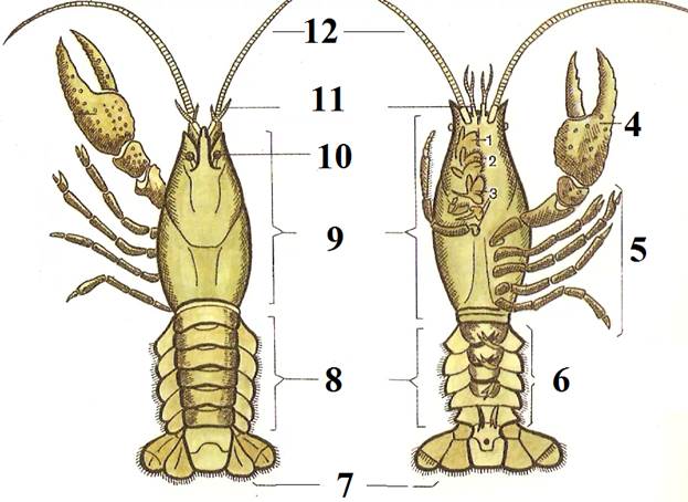 Установите последовательность расположения членистых конечностей на теле речного рака, начиная с головного отдела.