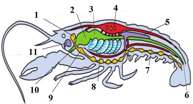 Установите последовательность расположения органов пищеварения в теле речного рака.