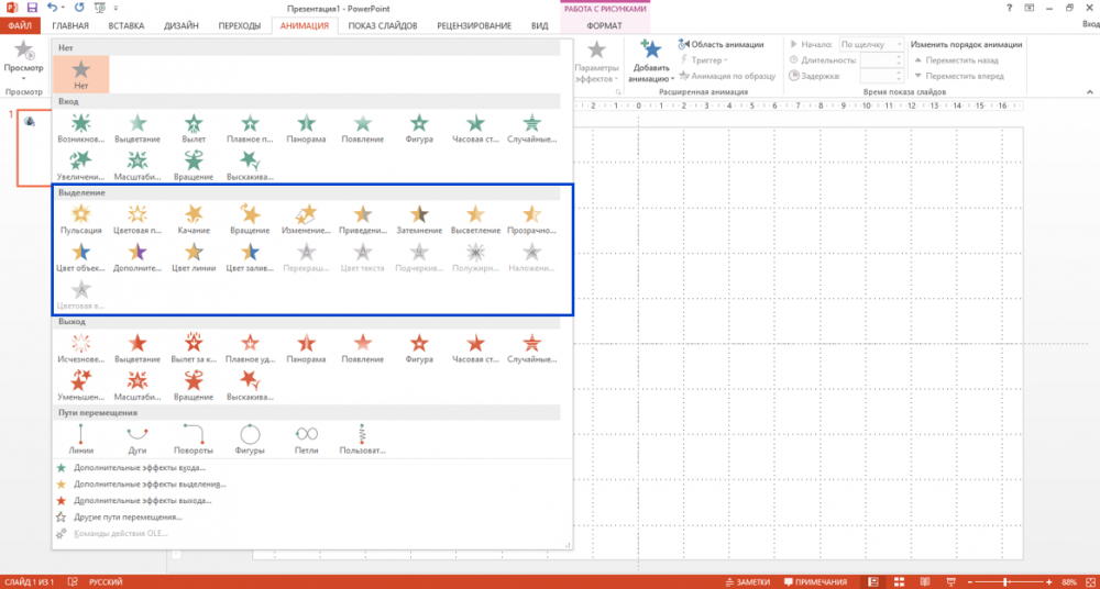 Какой тип анимации выделен в программе PowerPoint? Ответ вводите заглавными буквами.