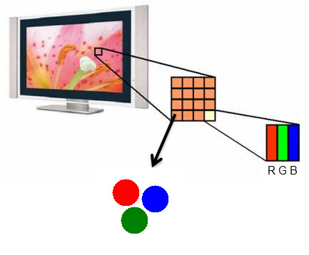 Как называется маленькая точка на экране монитора, которая может светиться разными цветами (см. картинку)?
