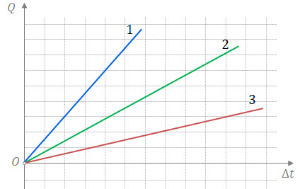 На рисунке изображены зависимости количества теплоты от изменения температуры для трёх тел одинаковой массы, но изготовленных из разных веществ. Укажите истинность высказываний о теплоёмкостях этих веществ.