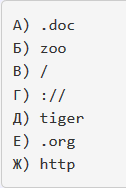 Доступ к файлу tiger.doc, находящемуся на сервере zoo.org, осуществляется по протоколу http. Фрагменты адреса файла закодированы буквами от А до Ж.