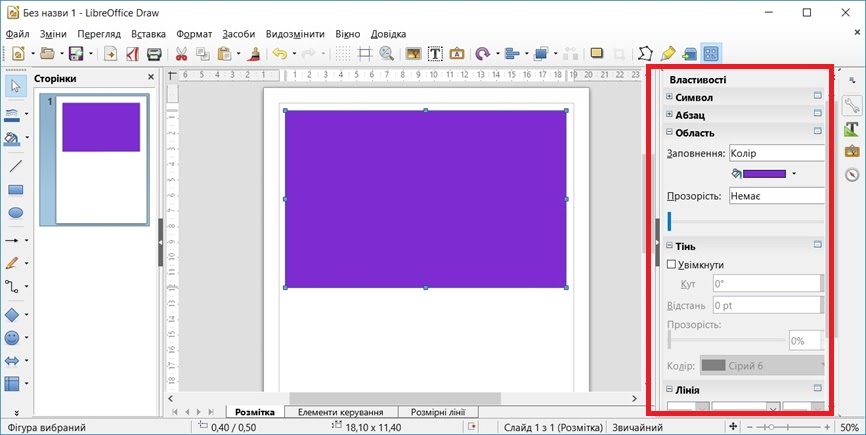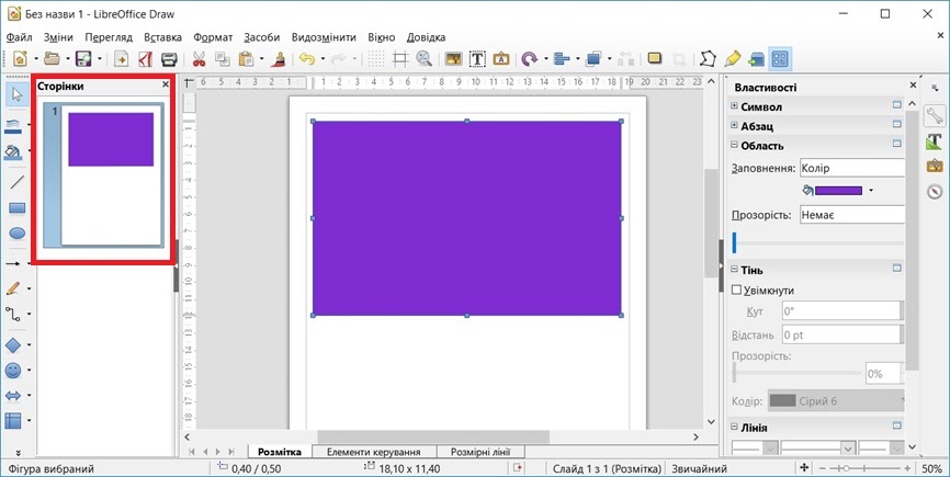 Вкажіть малюнок, де виділено Бічну панель у вікні векторного графічного редактора LibreOffice Draw.