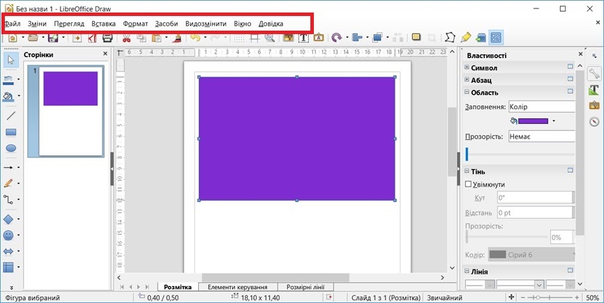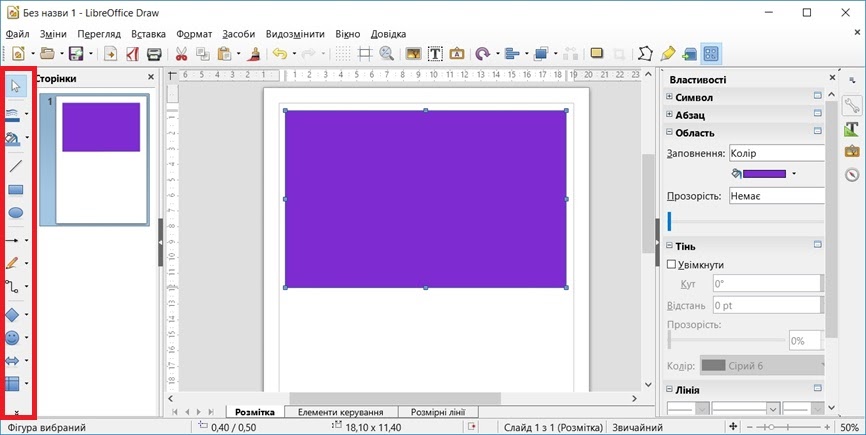 Вкажіть малюнок, де виділено Панель інструментів "Графіка" у вікні векторного графічного редактора LibreOffice Draw.