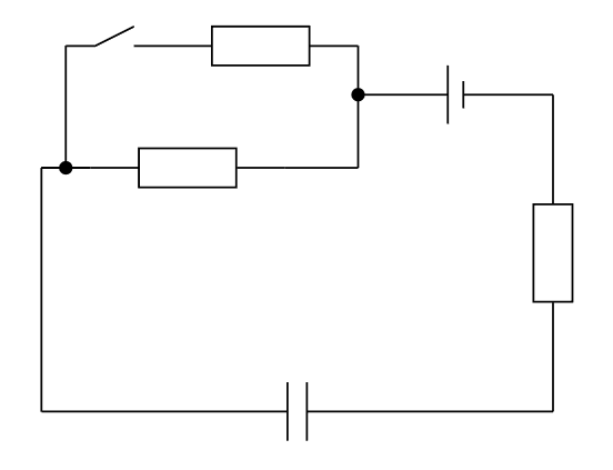 На рисунке изображена электрическая схема, состоящая из источника постоянного напряжения, трёх одинаковых резисторов и ключа. В первом опыте, полностью разряженный конденсатор включают в цепь при этом ключ разомкнут. Оказалось, что конденсатор полностью зарядился за 6 секунд. Затем конденсатор полностью разрядили и снова включили в цепь при этом ключ был замкнут. За какое время конденсатор зарядится теперь? Ответ дайте в секундах и округлите до десятых.