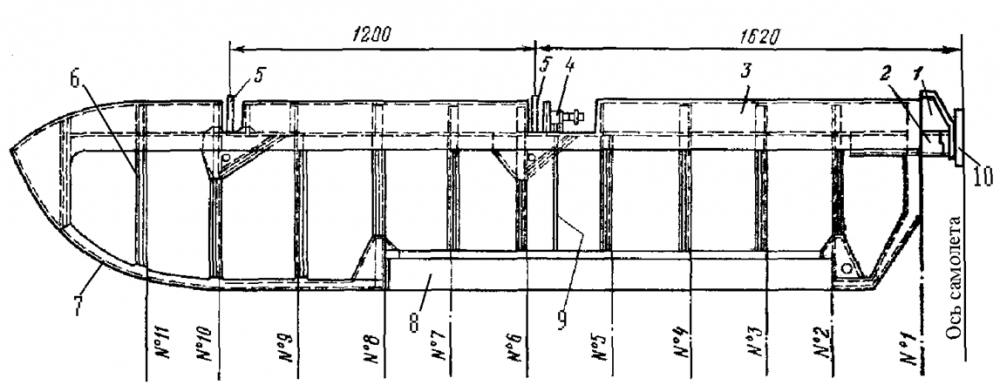 - 1— центральный кронштейн стабилизатора; 2— дюралюминиевая труба; 3— металлическая обшивка; 4— электромеханизм управления триммером УТ-6Д; 5— кронштейн подвески руля высоты к стабилизатору; 6— нервюра; 7— обод; 8—металлическая обшивка ; 9— тяга управления триммером; 10— фланец