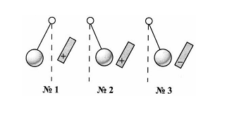 К наэлектризованным шарам, знаки зарядов которых неизвестны, подносят палочки с зарядом известного знака. На каком рисунке показан шар, имеющий отрицательный заряд?