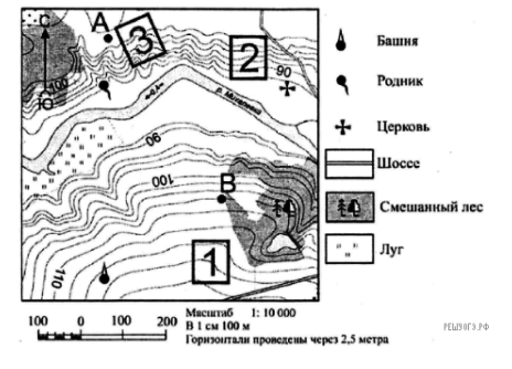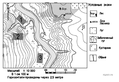 Школьники выбирают место для игры в волейбол. Оцените, какой из участков, обозначенных на карте цифрами 1, 2 и 3, больше всего подходит для этого.