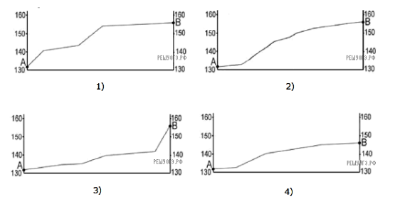 На рисунках представлены варианты профиля рельефа местности, построенные на основе карты по линии А–В разными учащимися. Какой из профилей построен верно?
