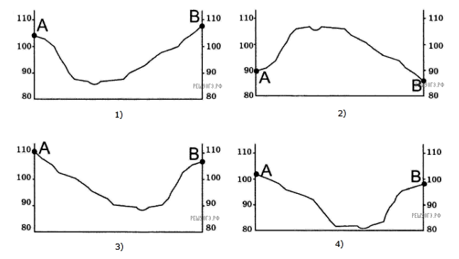 На рисунках представлены варианты профиля рельефа местности, построенные на основе карты по линии А−В разными учащимися. Какой из профилей построен верно?
