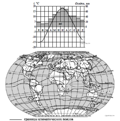 Проанализируйте климатограмму и определите, какой буквой на карте обозначен пункт, характеристики климата которого отражены в климатограмме.