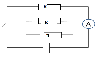 Используя схему изображенную на рисунке. Определите общее сопротивление и напряжение в цепи, если амперметр показывает 5 А, а сопротивление резисторов по 3 Ом.