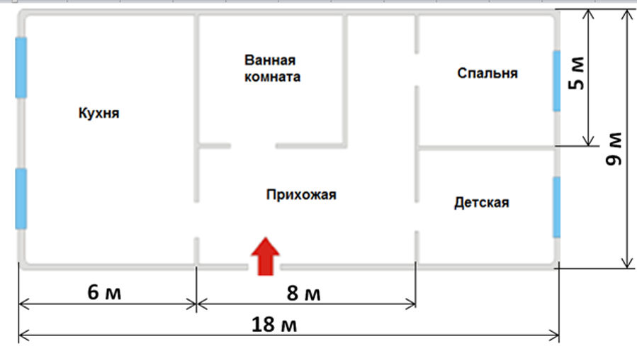 Дана схема квартиры. Чему равна площадь детской? В качестве ответа ввести только число, единицы измерения не вводить.