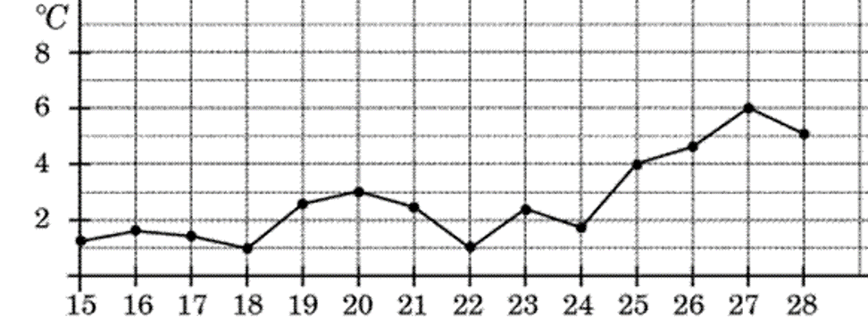На графике жирными точками показана среднесуточная температура воздуха в Пскове каждый день с 15 по 28 марта 1943 года. По горизонтали указываются числа месяца, по вертикали – температура в градусах Цельсия. Для наглядности жирные точки соединены линией. Определи по графику разность между наибольшей и наименьшей среднесуточными температурами за указанный период. В качестве ответа введите только число.