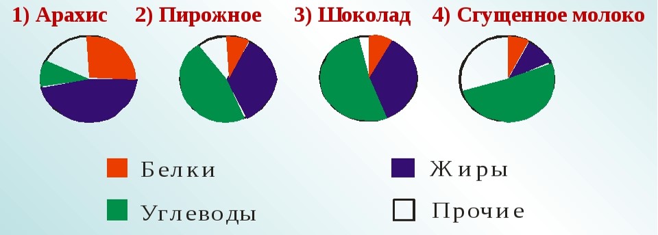 На рисунке показаны четыре круговые диаграммы, отражающие содержание питательных веществ в четырёх разных продуктах. Определите, в каком из этих продуктов процентное содержание жира наименьшее. В качестве ответа ввести название продукта в именительном падеже.