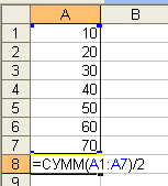 Чему будет равно значение ячейки А8, если в нее ввести формулу =СУММ(A1:A7)/2: