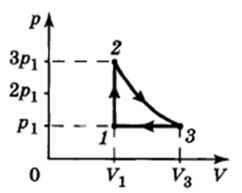 Рабочим телом двигателя служит одноатомный газ. Цикл состоит из адиабаты изохоры, и изобары. В каком или каких процессах газ получает тепло? (Процессы в ответе указывайте через запятую - 1-2, 2-3, 3-1)