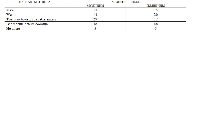 В стране социологической службой был проведен опрос совершеннолетних граждан. Им задавался вопрос: «Кто из членов семьи должен распоряжаться семейным бюджетом?». Найдите в приведенном списке выводы, которые можно сделать на основе данных таблицы.