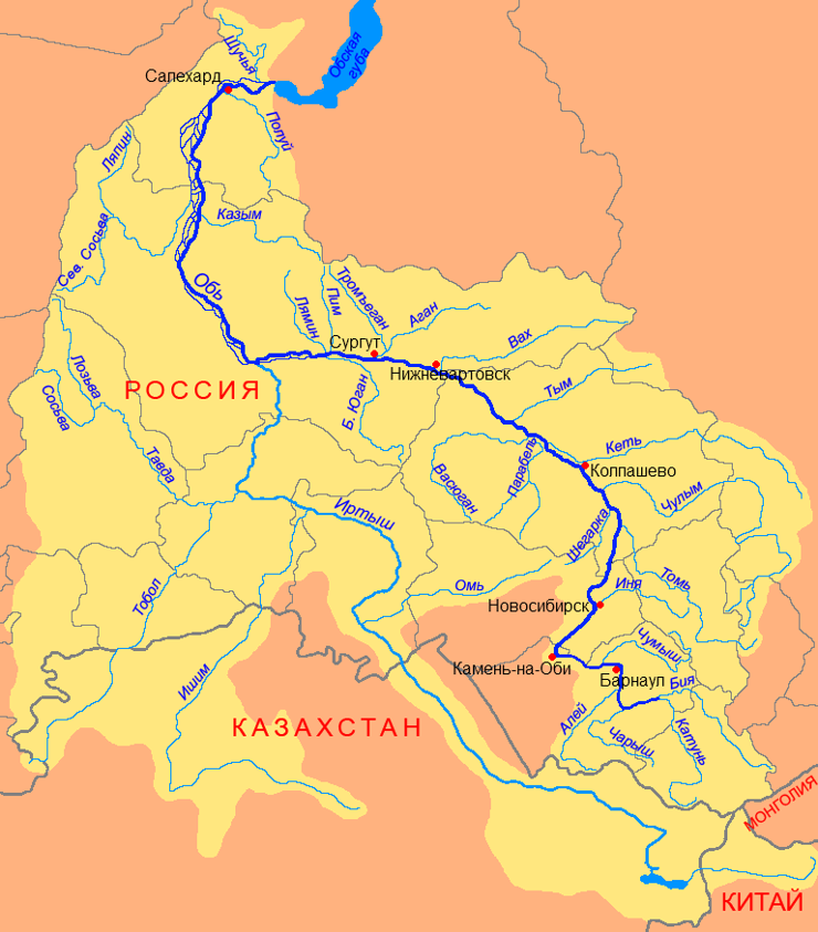 Обь берёт начало в предгорьях Алтая. В устье образует Обскую губу и впадает в Карское море.