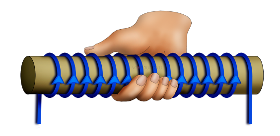 Если ладонью правой руки обхватить катушку с током так, чтобы четыре пальца расположились по направлению тока, то отставленный большой палец укажет....