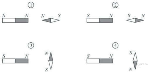 К северному полюсу полосового магнита подносят маленькую магнитную стрелку. Укажите рисунок, на котором правильно показано установившееся положение магнитной стрелки.