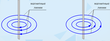 Если вращать ручку буравчика так, чтобы его остриё двигалось по направлению тока в проводнике, то направление вращения ручки буравчика укажет направление линий магнитного поля тока.