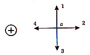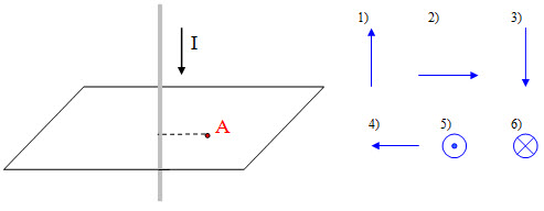 На рисунке изображен проводник с током. Символ "+" означает, что ток в проводнике направлен от наблюдателя. Какое направление имеет вектор магнитной индукции поля в точке а?
