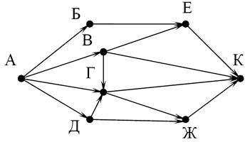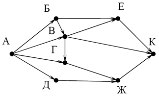 На рисунке – схема дорог, связывающих города А, Б, В, Г, Д, Е, Ж и К. По каждой дороге можно двигаться только в одном направлении, указанном стрелкой. Сколько существует различных путей из города А в город К, проходящих через город В?![]() |
