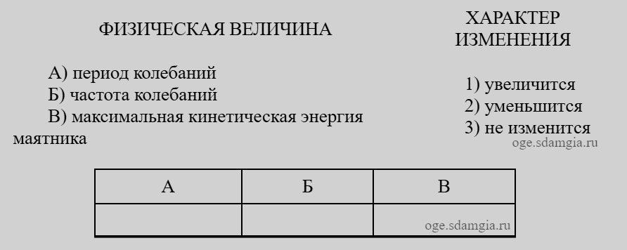 Установите соответствие между физическими величинами и их возможными изменениями, анализируя следующую ситуацию: «Нитяной маятник совершает незатухающие гармонические колебания. Если увеличить длину нити маятника, не меняя его массу и начальную высоту подъёма от положения равновесия, то …»