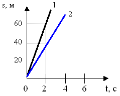 По графику пути равномерного движения определите скорости движения 1 и 2 тела.
