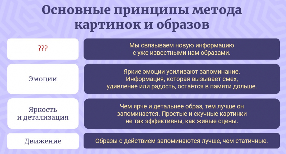 Какие принципы помогают лучше запомнить информацию с помощью метода картинок и образов? Выберите все подходящие.