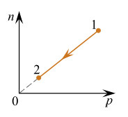 При переводе идеального газа из состояния 1 в состояние 2 концентрация молекул n прямо пропорциональна давлению р (см. рисунок). Масса газа в этом процессе остается постоянной. Какой это процесс?