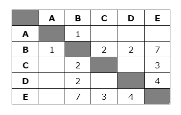Между населёнными пунктами А, В, С, D, Е построены дороги, протяжённость которых (в километрах) приведена в таблице: