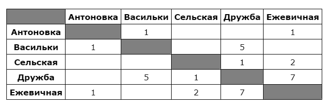Учитель Иван Петрович живёт на станции Антоновка, а работает на станции Дружба. Чтобы успеть с утра на уроки, он должен ехать по самой короткой дороге. Проанализируйте таблицу и укажите длину кратчайшего пути от станции Антоновка до станции Дружба: