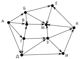 На рисунке - схема дорог, связывающих города А, Б, В, Г, Д, Е, Ж, З, И, К. По каждой дороге можно двигаться только в одном направлении, указанном стрелкой.